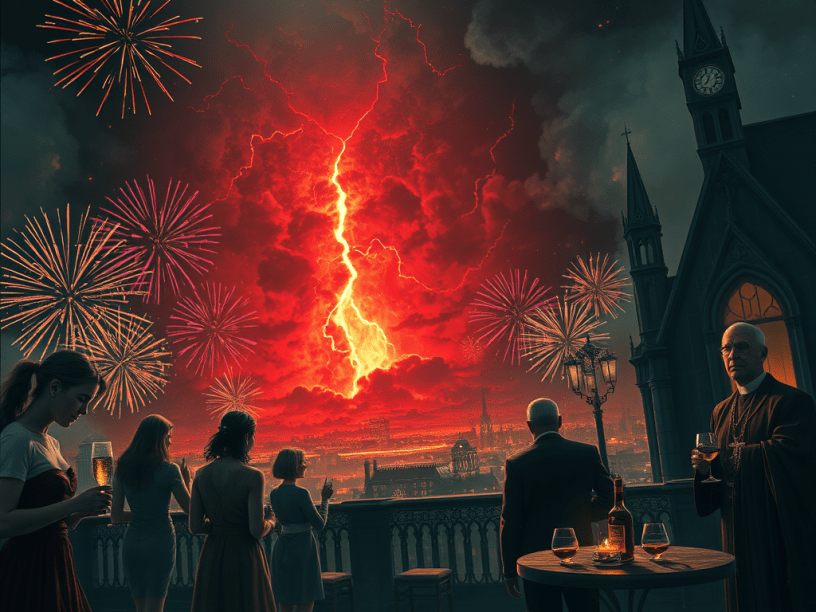 El reloj marcaba las 23:57. Marta repasó su lista de propósitos para el año nuevo mientras servía una última copa de champán. “Perder peso, aprender francés, conseguir un trabajo mejor…”. Pero una grieta en el cielo, tan real como los fuegos artificiales que esperaban encender, la hizo tambalearse. La grieta pulsaba con un brillo rojo, como si el universo mismo estuviera desangrándose.