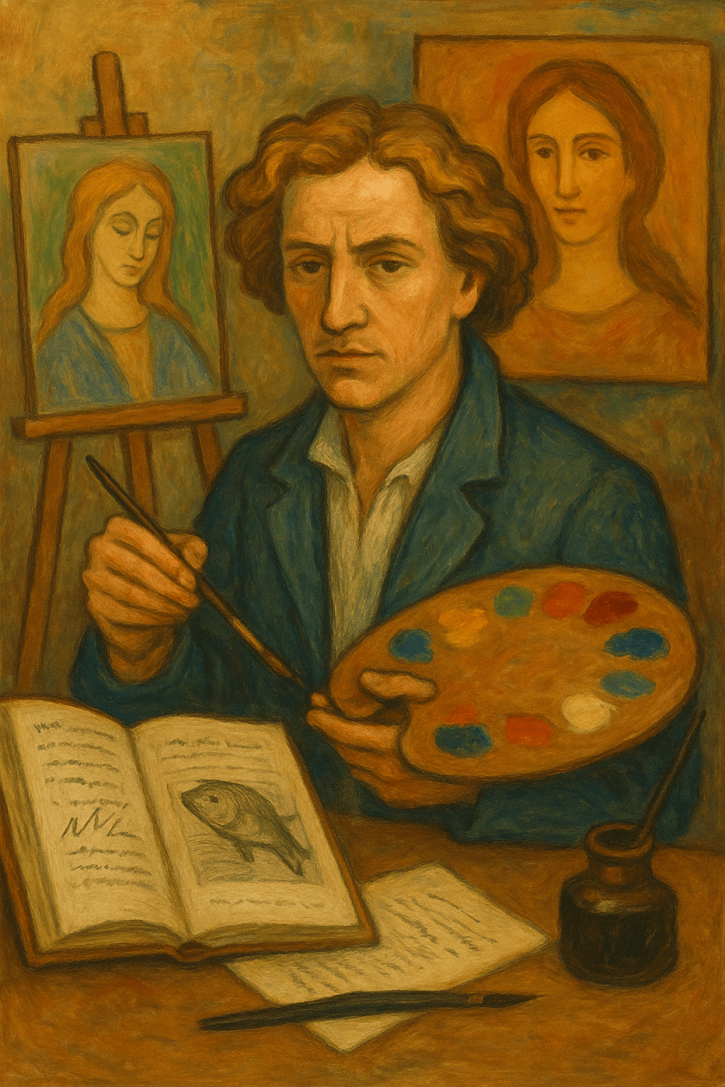 Poeta, grabador, ilustrador. Blake es el ejemplo más temprano y emblemático del artista total. En sus Songs of Innocence and of Experience (1789-1794), texto e imagen son inseparables. Sus visiones místicas y su rebeldía contra la razón ilustrada lo llevaron a crear un universo poético que solo podía existir si se veía además de leerse. Sus grabados coloreados a mano son parte integral de su obra literaria, no un simple acompañamiento.