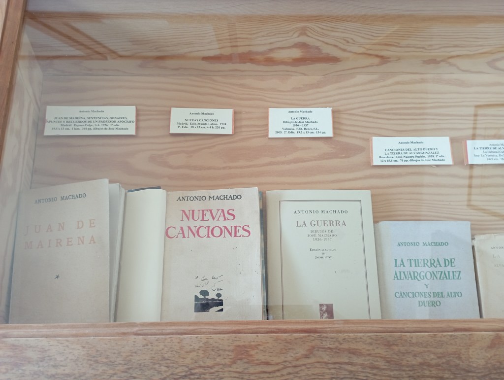 En una de las vitrinas aparecen ejemplares originales de sus libros: Nuevas canciones, La guerra, La tierra de Alvargonzález, Juan de Mairena. Verlos ahí, con sus cubiertas sobrias y su tipografía de época, provoca una emoción íntima, como si cada volumen guardara todavía la voz del poeta.
